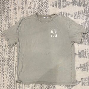 Casual short sleeve crewneck tee with small front graphic. Soft cotton feel and relaxed fit. Neutral sage color for easy styling.