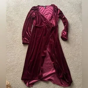 Luxurious velvet wrap robe in a deep burgundy hue. Long sleeves with a wrap tie for an adjustable fit. Soft, drapey fabric with elegant sheen. Versatile piece for lounging or casual wear.