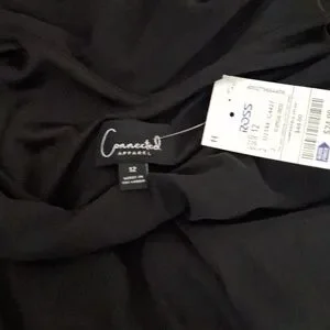Off-shoulder design with soft ruffle neckline. Smooth, drapey fabric for easy wear. Classic, versatile look for any occasion.