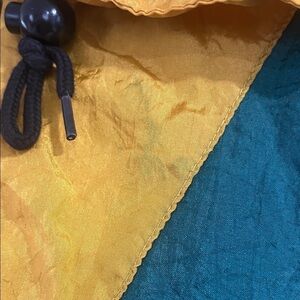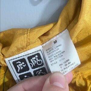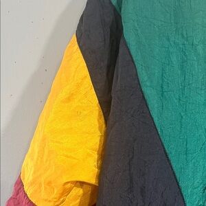 Dynamic jacket with striking color blocks. Features yellow, green, black, and red. Ideal for outdoor activities. Size medium, 61 cm pit to pit, 69 cm length