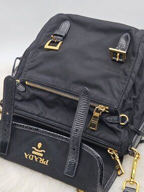 Durable nylon bag with Saffiano leather trim and gold-tone hardware.