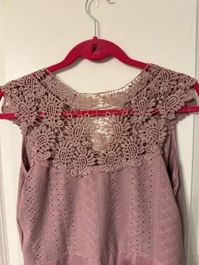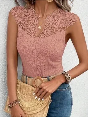 Delicate lace sleeveless top in dusty rose. Features intricate crochet lace neckline and fitted silhouette for a polished look. Lightweight and breathable fabric ideal for layering or wearing alone. Dusty rose color adds a soft, feminine touch to any outfit.