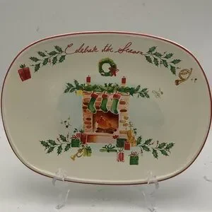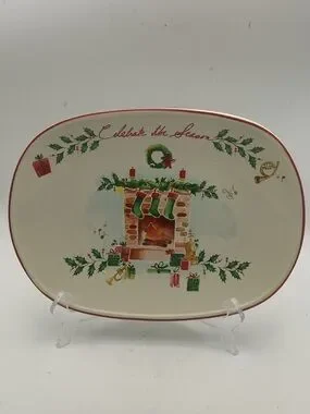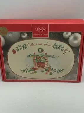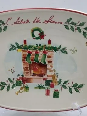 Adorable Lenox Holiday “Celebrate the Season” serving tray featuring a fireplace and stocking design and red trim. Includes original packaging.