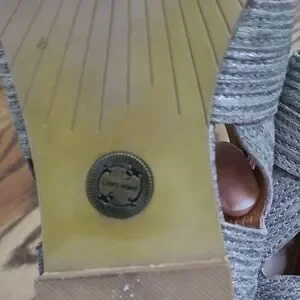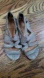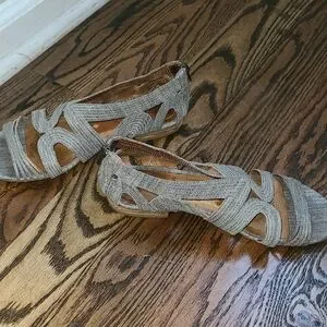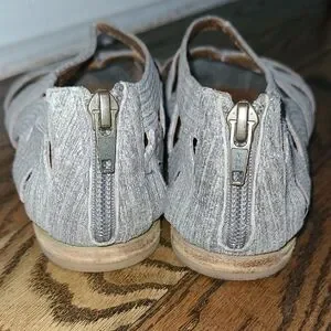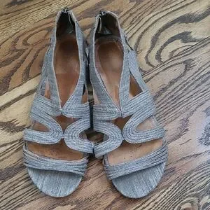 Previously owned and gently worn. Gladiator sandals from Anthropologie. Elegant women's sandals in metallic gray. Soft, textured straps provide a secure and comfortable fit. Leather interior. Zipper closure at the back of the sandal means they are easy to get on and off. Has some wear inside and on bottom but straps and zippers are in excellent shape. No stains or tears.