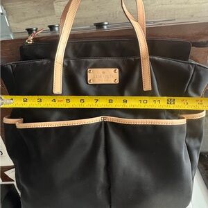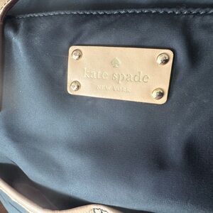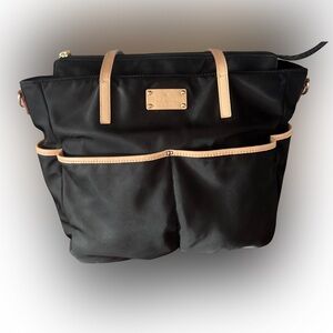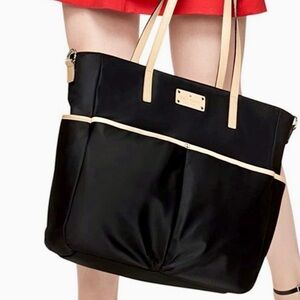 Spacious kate spade tote in black nylon. Light tan leather trim and handles. Front exterior pockets for easy access. Gold-tone nameplate detail on front. Sleek, versatile design for daily use. Some new mamas even use this as a diaper bag! It’s perfect for all occasions!