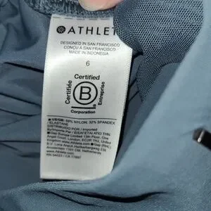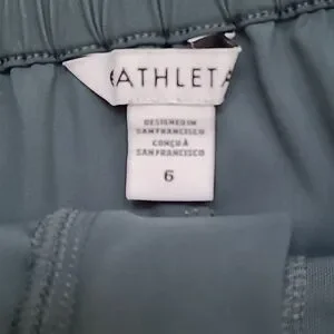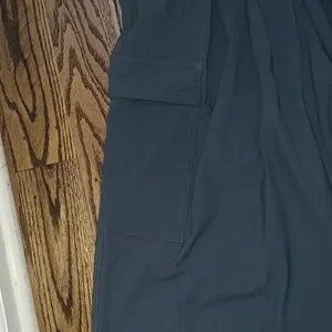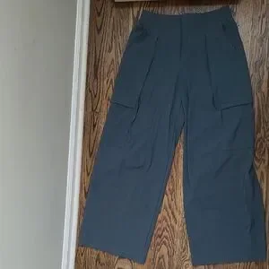 Previously owned and gently worn. Athleta Pinnacle high-waist wide-leg pants with cargo pockets. Teal color called Eden. Clasp, button and zipper closures. Elastic in the back. Size 6. Relaxed fit. Smooth, structured fabric with clean pleats. Nice weight fabric. Not too heavy. Not too noisy!