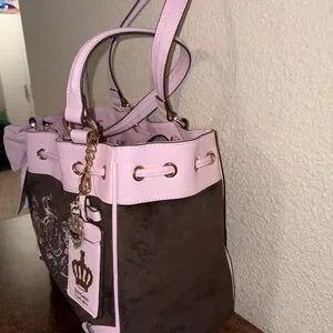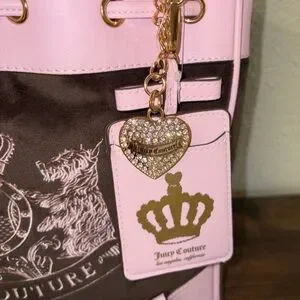 Juicy Couture Original Scotty Daydreamer tote featuring the iconic crown crest design in a pink and brown colorway. Includes gold-tone hardware, drawstring detail, double shoulder straps, and signature Juicy charm with matching card holder.