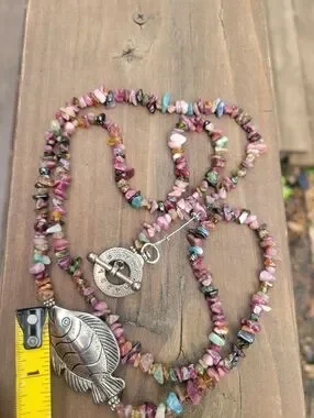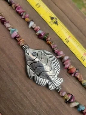 Sterling-Tone Fish Pendant Belt or Necklace with Multicolor Tourmaline Chips