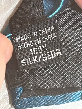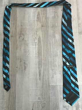 Sleek diagonal striped tie in blue and black. Smooth sheen fabric with bold contrasting stripes. Sharp, modern look for dress or office wear.