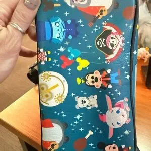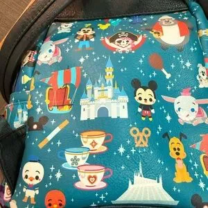Playful mini backpack with colorful Disney character print. Teal blue base with vibrant multicolor icons. Gold-tone zipper accents. Fun park-themed design perfect for fans.