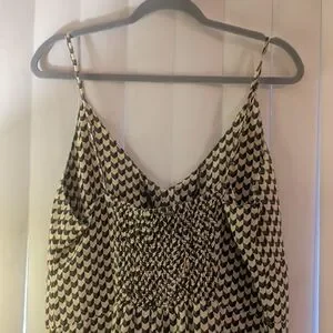 Lightweight Reef maxi dress with thin straps. V-neck front and subtle button detail. Flowy silhouette for casual wear. Simple monochrome houndstooth pattern.