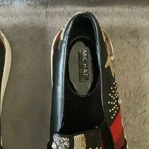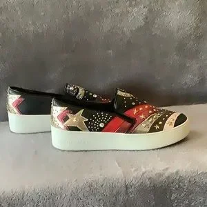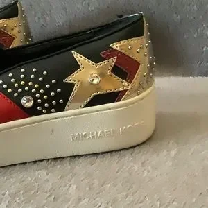 Slip-on sneakers by MICHAEL Michael Kors. Black leather upper with red and metallic accents. Gold-tone star studs and embellishments. White platform sole. Fashion-forward casual style.