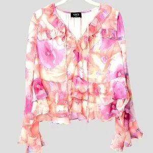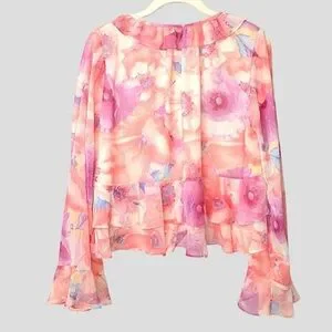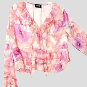 VICI Womens S Fairy Oversized Sheer Ruffle Blouse Whimsical Romantic Floral Blush