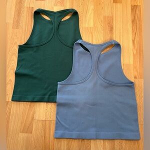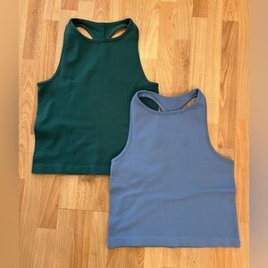 Free People high-neck racerback ribbed tank tops in forest green and slate blue. Both are size M/L. Great condition - only worn a couple times