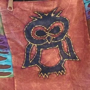 Stylish boho shoulder bag in multi-color patchwork. Features vibrant purple, teal, green, and brown panels with decorative stitching. Comfortable strap for all-day wear and a front zip pocket for easy access. Versatile everyday bag that adds a colorful accent to any outfit.