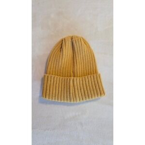 Cozy ribbed knit beanie in a warm mustard yellow with a subtle embroidered smiley face patch. Soft, stretchy fit that's perfect for everyday wear, fall layering, or casual street style.