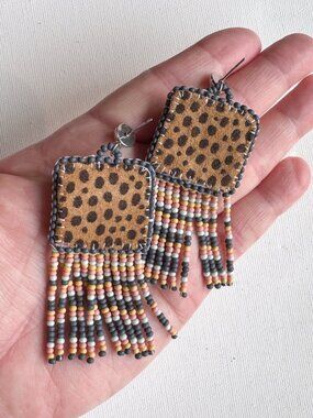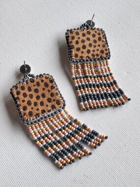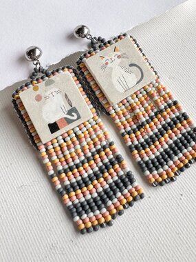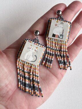 Playful handmade earrings featuring ceramic cat illustrations framed with multicolour beadwork and finished with flowing fringe.