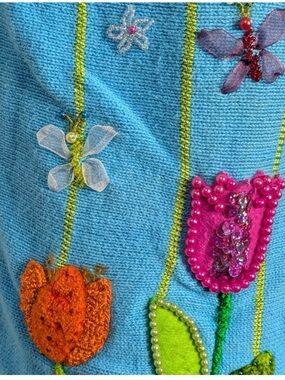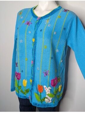 The Quacker Factory cardigan in bright turquoise is a delightful addition to any spring wardrobe. Its vibrant color is perfect for brightening up your outfits, while the charming embroidered details—tulips, leaves, butterflies, and a playful bunny—bring a whimsical touch that celebrates the season. The vertical stitched vine details, accented with colorful flowers, add a unique texture and visual interest.