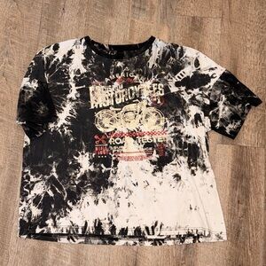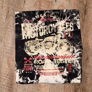Bold graphic tee with motorcycle design. Features red accents. Perfect for casual wear.