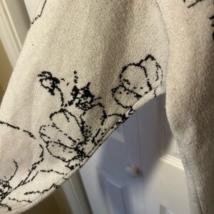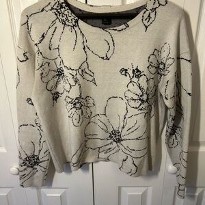 Soft cream crewneck sweater with a bold black floral print. Lightweight knit for everyday comfort. Classic silhouette designed for easy layering.