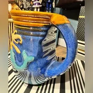 Handcrafted blue and turquoise ceramic mug with a raised mermaid motif. Features rich blue glaze with turquoise tail accents and warm golden rim. Durable ceramic construction for everyday use. Vibrant colors enhance any home decor.