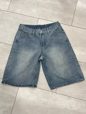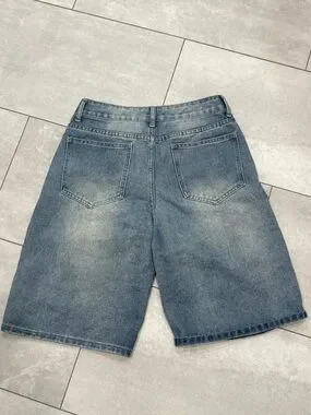 Classic high-rise denim shorts with a relaxed wide leg. Soft blue wash with subtle fading. Five-pocket style and belt loops. Versatile casual staple.