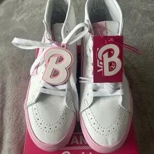 Vans x Barbie Sk8-Hi Tapered Stackform Shoes. These kicks are a tribute to the iconic Barbie doll, bringing her signature style and playful charm to life. Imagine stepping into a world of pink dreams and endless possibilities. High top silhouette. Leather uppers. Signature rubber waffle outsoles. 34 mm platform height. Lace-up closure.