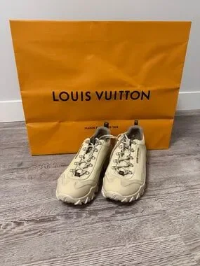 Selling Louis Vuitton sneakers in a cream/beige colorway. These have a premium trail / hiking-inspired design with a chunky rugged “tooth” outsole, silver-tone metal lace hooks/eyelets, and thick round laces. Louis Vuitton branding is embossed on the side, and the insole reads “Louis Vuitton Paris.” The shoes also feature monogram accents on the pull tabs/side details.