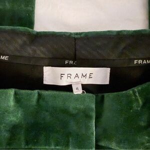 FRAME velvet pants in a rich emerald green tone — more vibrant and luxe than the typical muted green velvet styles. These feature a flattering high-rise fit with a slim leg and subtle bootcut flare, giving a polished, tailored silhouette.
