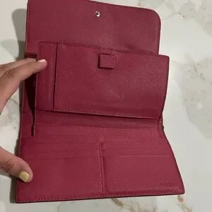 Coach continental wallet with signature logo pattern. Flap closure with metal logo plaque. Streamlined and elegant design.