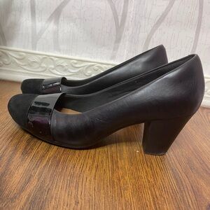 Classic black block heel pumps with a glossy strap detail. Suede toe cap and soft cushioned insole for all-day comfort. Versatile design pairs easily with work and dress outfits.