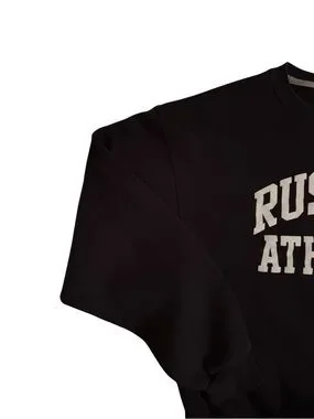 Classic crewneck sweatshirt by Russell Athletic. Solid black body with bold white collegiate logo. Soft, heavyweight fabric for everyday wear. Ribbed cuffs and hem for secure fit.