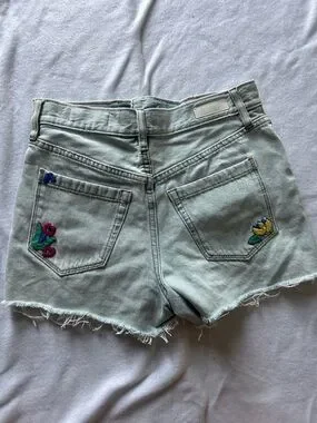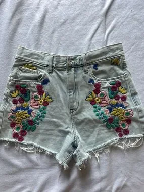 These shorts and a great tan! Costal hippie, flower power!! Boho. High waisted light denim. Beautifully embroidered floral design. Raw hem.