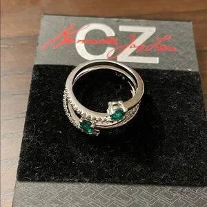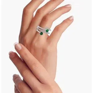 Spiral ring with two vivid green stones. Silver-tone band with sparkling pavé accents. Open adjustable design for versatile wear. Bold yet refined statement piece.
