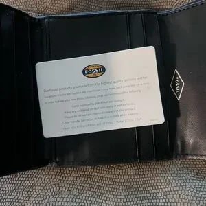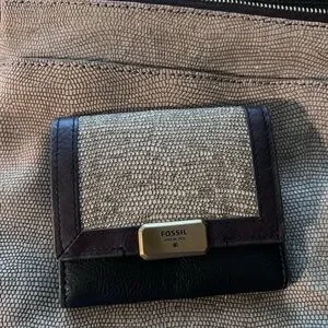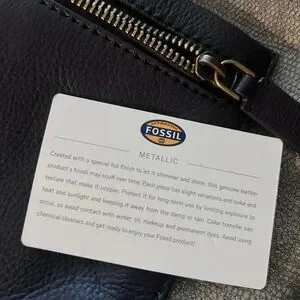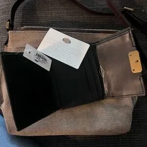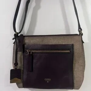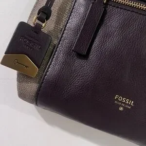 Compact crossbody with front zip pocket and a back pocket that is open. Top zipper closure for security. Adjustable shoulder strap for easy wear. Subtle bronze hardware and Fossil logo detail. Matching wallet that is new with tags. Both items come with their authenticated cards.