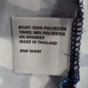 Material: 100% Polyester (Body), 96% Polyester 4% Spandex (Trims)