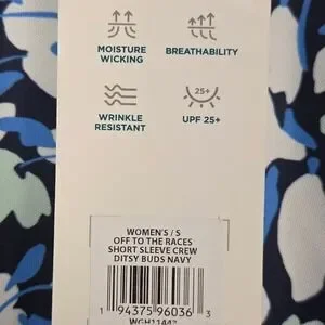 Off To The Races short sleeve crew neck top in Ditsy Buds Navy floral print. This performance-oriented piece features a moisture-wicking and breathable fabric designed for active comfort. The wrinkle-resistant material offers UPF 25+ protection, making it ideal for outdoor activities or sports.