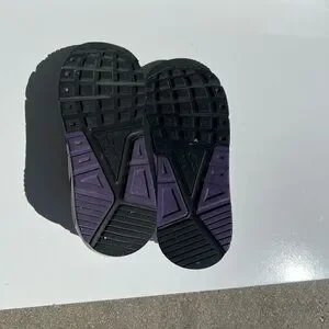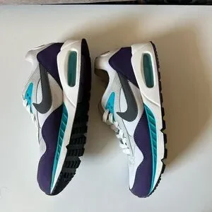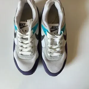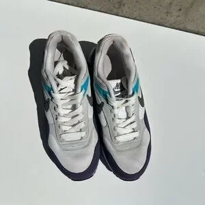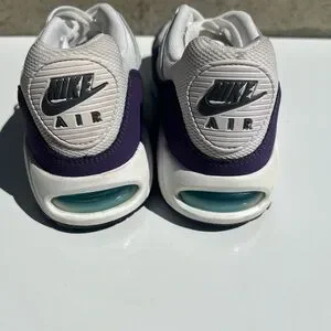 Iconic Air Max profile with vibrant accents. White mesh upper with purple overlays. Teal details on midsole and eyelets. Gray Swoosh branding. Visible cushioned Air unit for comfort.