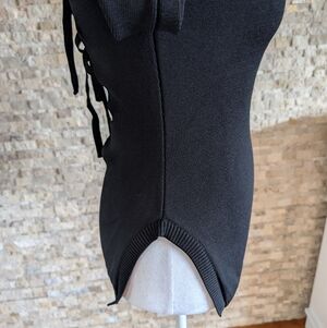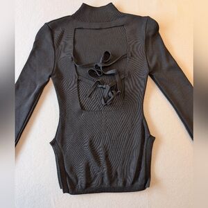 This edgy sweater tunic features a high mock neck front contrasting with a dramatic open back with tie-string corset style details. The ribbed knit material provides a bodycon fit with plenty of stretch. High-cut side slits at the hem add an extra bold touch. Slim bodycon fit.