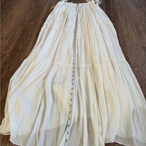 Lightweight white midi dress with a smocked top and adjustable tie straps. Flowy tiered skirt for breezy movement. Simple and versatile summer piece.