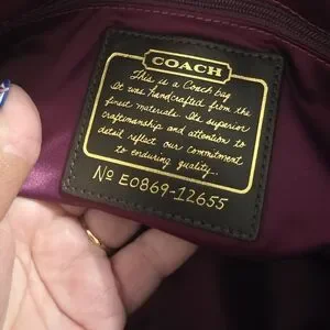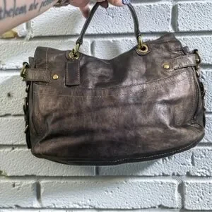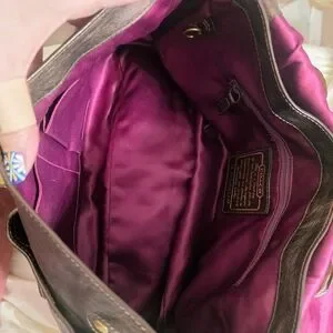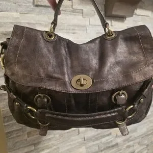 Coach shoulder bag in metallic brown leather. Features turn-lock front closure and top handle. Includes detachable strap with brass-tone hardware. Leather hang tag adds signature detail.