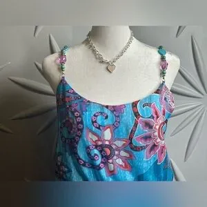 B. Darlin SZ S blue & purple multicolored maxi dress w/adjustable spaghetti straps. The front straps are made of jewel tone and silver beads. The dress is fully lined and has 2 front pockets. The dress has belt loops but no belt came with it. Fabric 100% polyester. Bust 32”-38”, elasticized waist 28”-36”. EUC. NECKLACE NOT INCLUDED!