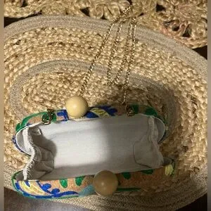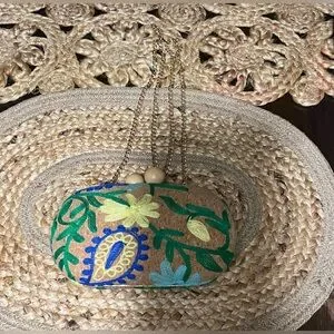 This unique floral embroidered clutch features a natural cork-like or woven straw texture, accented by vibrant green vines and colorful yellow and blue blossoms. It is characterized by its kiss-lock closure with oversized wooden-style spherical clasps and a delicate gold-tone chain. Perfect for adding a natural, colorful touch to any outfit.