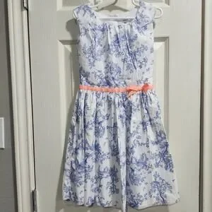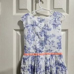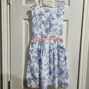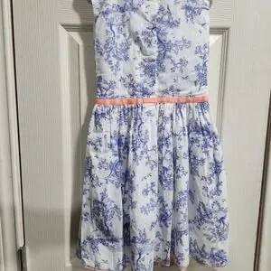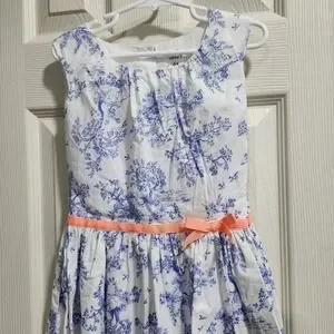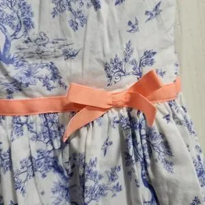 Carter's Girls 6X Blue Toile Print Dress Coral Ribbon Bow Sleeveless Cotton
