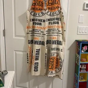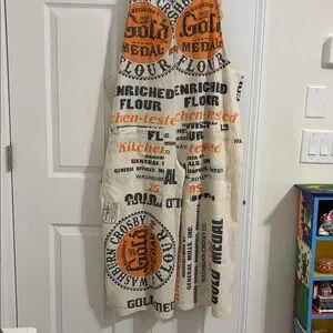 Cream apron-style Overalls with bold Gold Medal Flour print. Orange and black graphic branding across front. Casual, statement kitchen-inspired piece. Lightweight and eye-catching.pit to 24"X52 waist