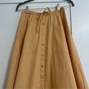 Lightweight mustard midi skirt with a front button placket and pockets. Elastic waist with drawcord for a comfortable fit. Casual, versatile style perfect for everyday wear. Mustard color adds warm, seasonal appeal.