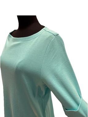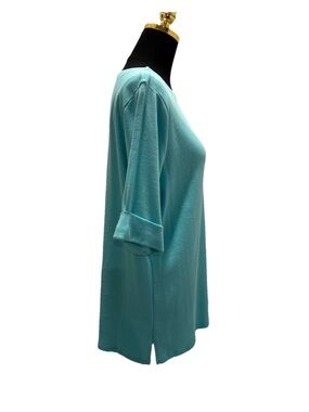 This Style & Co Women's Aqua Blue Short Sleeve 100% Cotton Top in size 2X is a versatile and comfortable addition to any woman's wardrobe. Made with 100% cotton knit fabric, this solid Aqua blue top features a round neckline, short sleeves, and a pullover closure. Perfect for casual occasions in all seasons, this top offers a regular fit for a comfortable and flattering look. Easy to care for with machine washable instructions, this stylish top from Style & Co is a must-have for any fashion-forward woman. Length 29 in., Pit-Pit 23