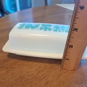 Vtg Pyrex Amish Butterprint Butter Dish/Lid Rooster Turquoise White Blue 7"