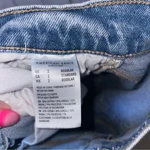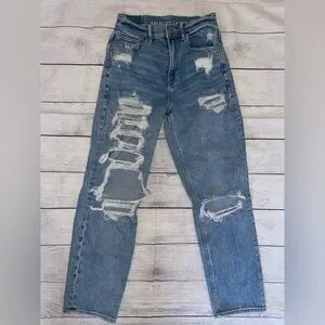 American Eagle Outfitters high-rise women's jeans in medium blue with heavy distressed detailing. Comfortable denim with a relaxed fit and ripped accents for a vintage, on-trend look. Easy to style for casual, everyday wear.