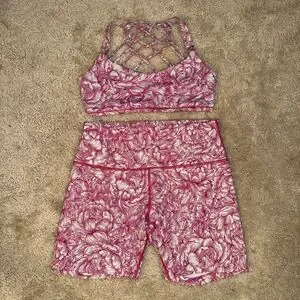 Two-piece active set with matching floral print. Strappy lattice back on the bra. High-waist shorts with full coverage. Stretchy, breathable fabric. Great for workouts or athleisure.